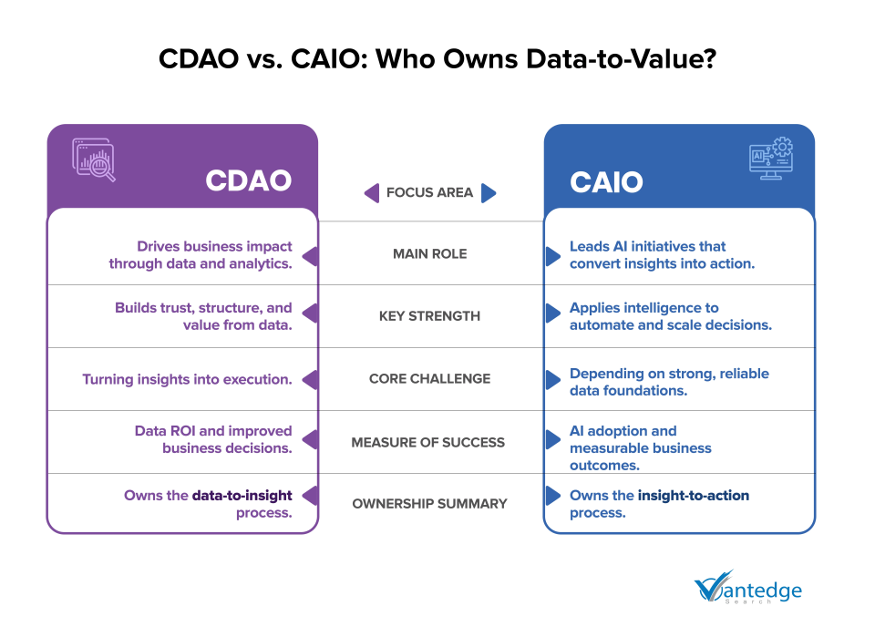 CDAOs argue for end-to-end accountability because data quality, governance, architecture, and analytics adoption increase or decrease together. On the other hand, CAIOs argue that AI now changes how work is done, which requires a single owner for models, guardrails, and usage at scale.